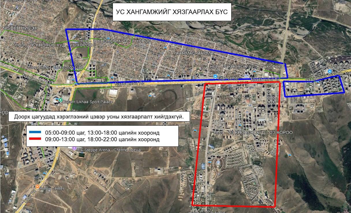 ХУД -ийн 5.6.7.23.24-дүгээр хороодын хэрэглэгчийн хэрэглээний усыг 2025.11.06 өдрийн 22:00 цагаас 2025 .11.08 ны өглөөний 08:00 цаг хүртэл хэсэгчилсэн байдлаар хязгаарлах юм.Тодруубал замын урд хэсэг буюу Food City худалдааны төвөөс баруун тийш “Нүхтийн ам” хүртэл замын хойд талдаа “Мөнх Хадаа” -аас Нисэхийн тойрог хүртэл сууршилийн хэсэг хамрагдах юм.
