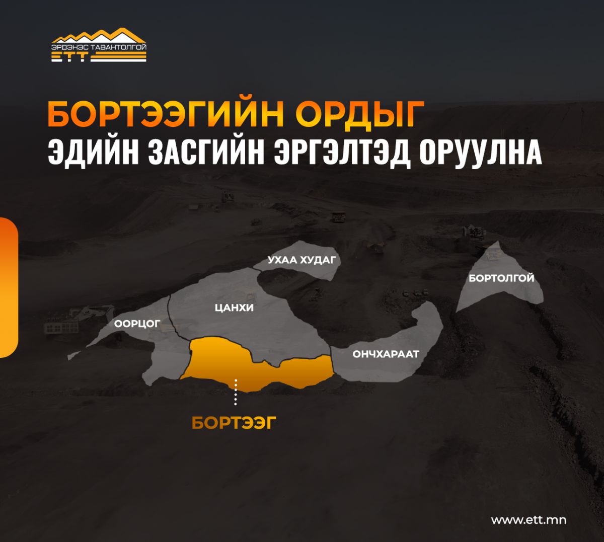 Бортээгийн орд - суурь судалгаа бүрдсэн төсөл: “Эрдэнэс Тавантолгой” ХК-ийн эзэмшдэг тусгай зөвшөөрлийн талбайд стратегийн ач холбогдол бүхий Тавантолгойн нүүрсний бүлэг орд болох Цанхи, Бортолгой, Ончхараат, Бортээг зэрэг хэсгүүд багтдаг.
