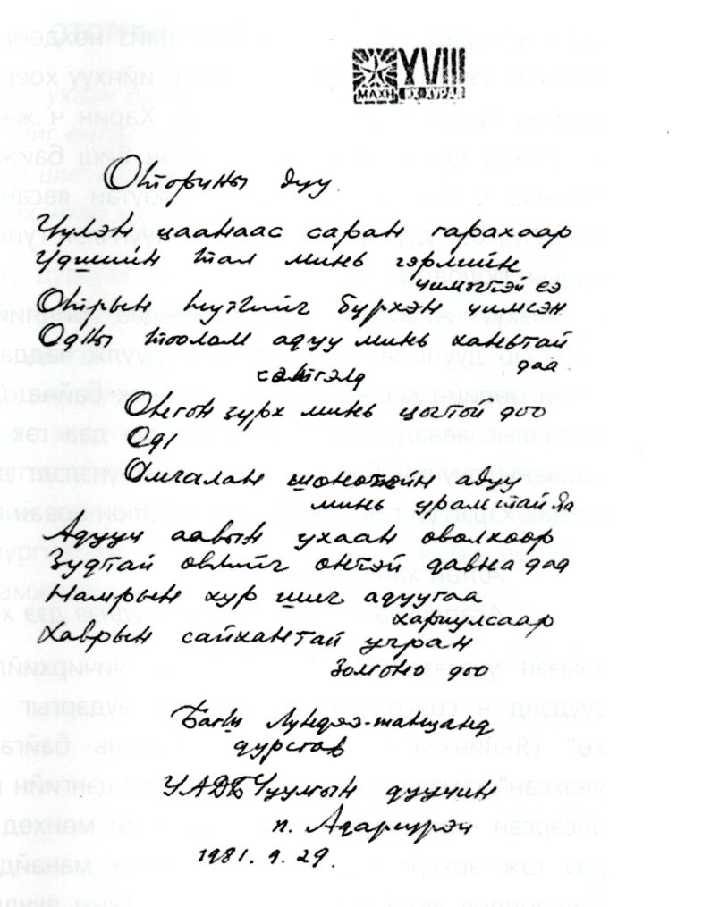 Багш Лүндээжанцанд дурсгав. УАДБЧуулгын дуучин П.Адарсүрэн 1981.09.29 хэмээн манай гэрийн аяганы ширээн дээр бичиж суусан нь өчигдөр болсон юм шиг санагдан хоолой торно.